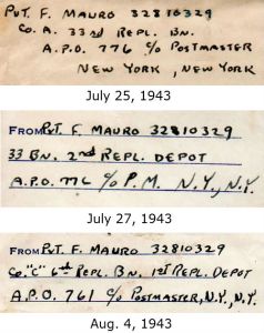 For example, I’ve noticed that in Babe’s first few letters from North Africa, his return address changes three times. The first two may be the same, but rendered differently, but he moves from the “2nd Replacement Depot” to the “1st Replacement Depot” from one letter to the next.