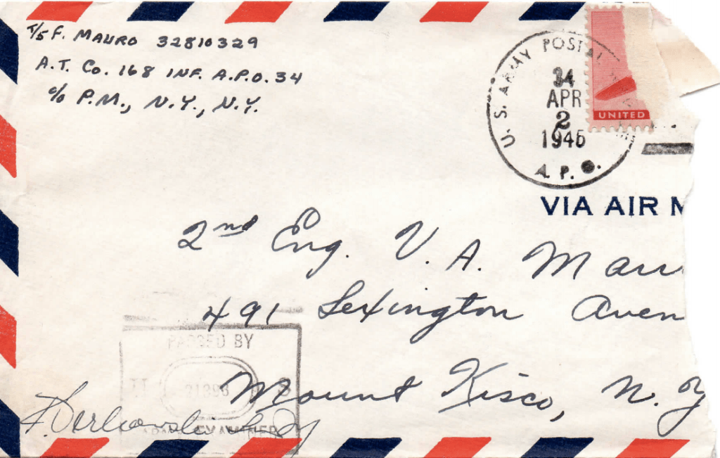 Letter dated March 31, 1945; postmarked April 2, 1945. It was addressed to 2nd Eng. V.A. Mauro (his brother Vin) at their home address.