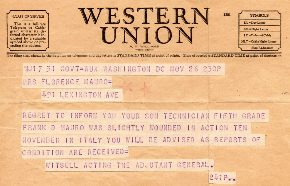 T/5 Mauro wrote that he had been wounded in the right foot “somewhere in Italy,” While the telegram read “slightly wounded in action Nov. 10 in Italy.”
